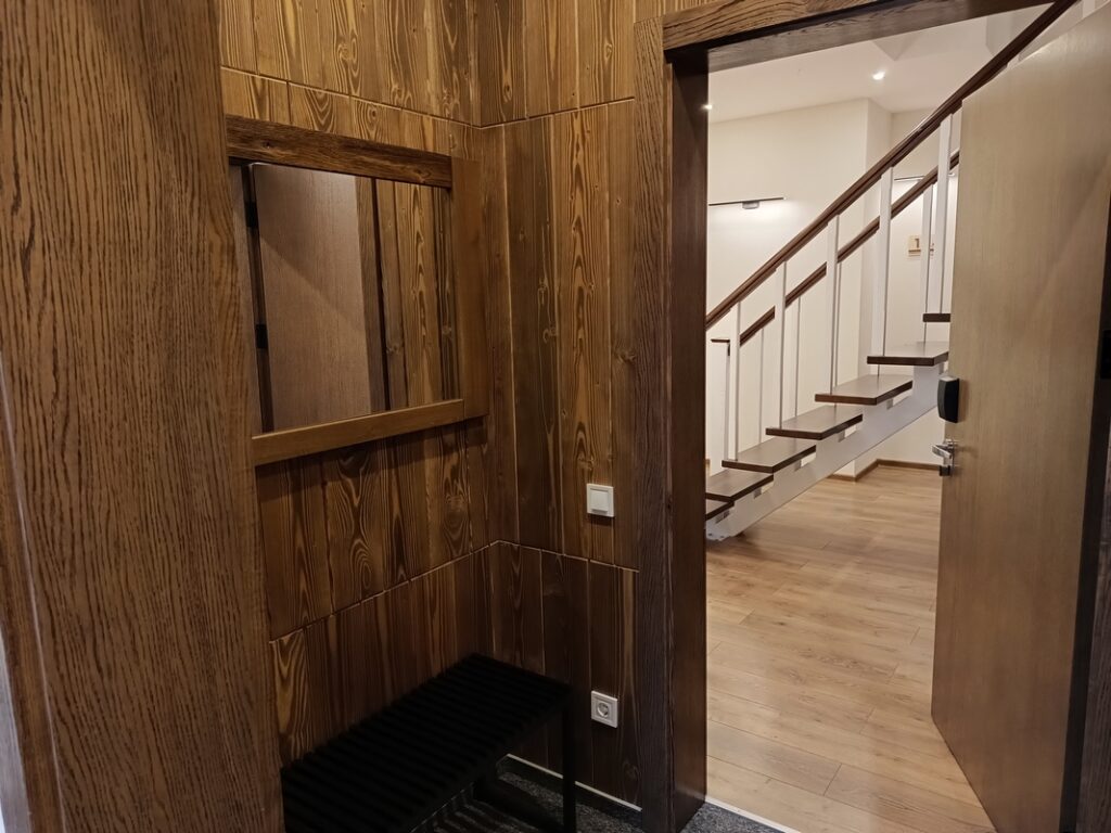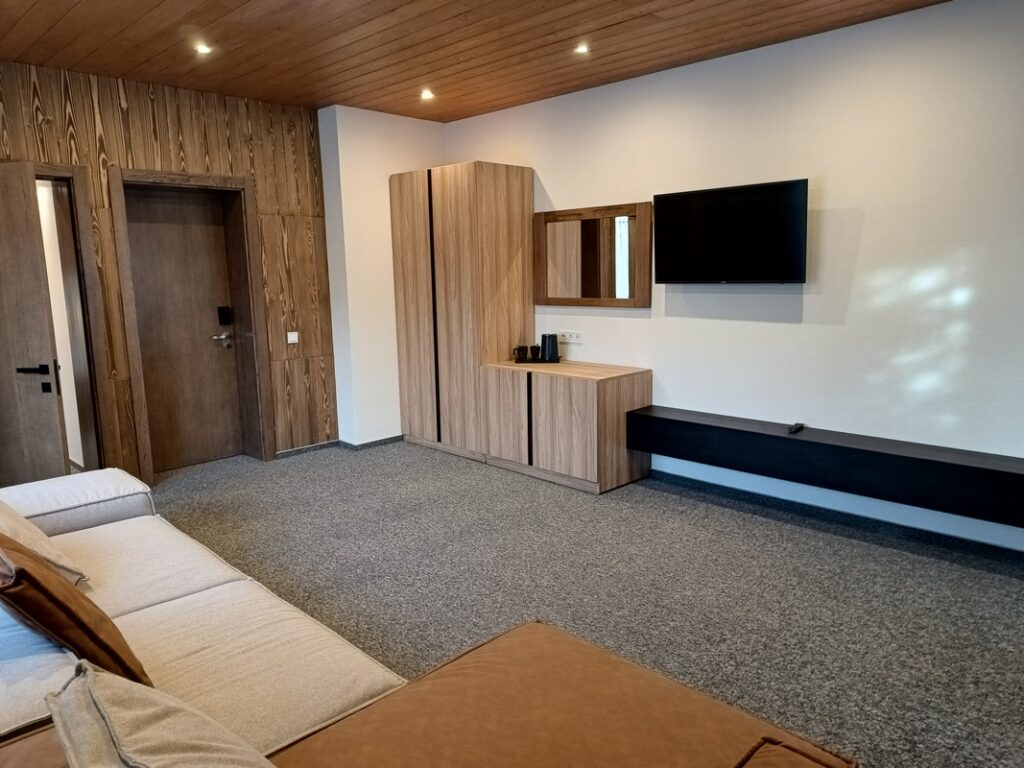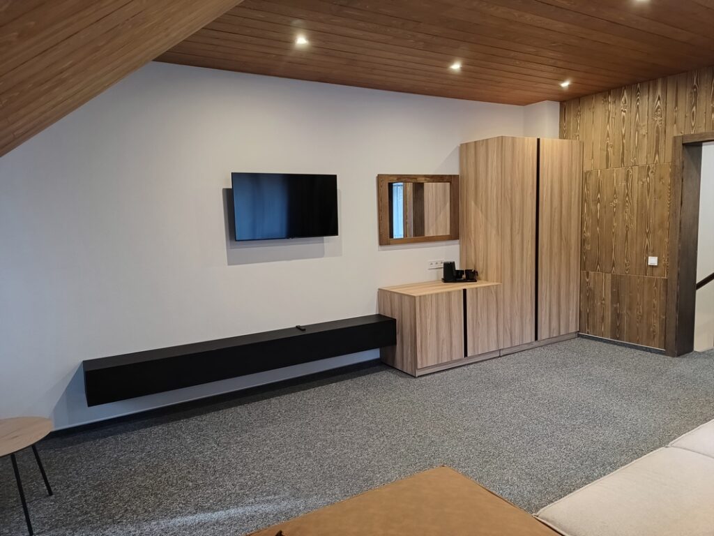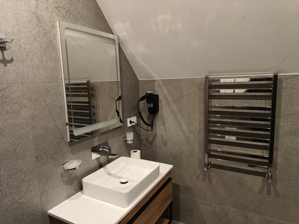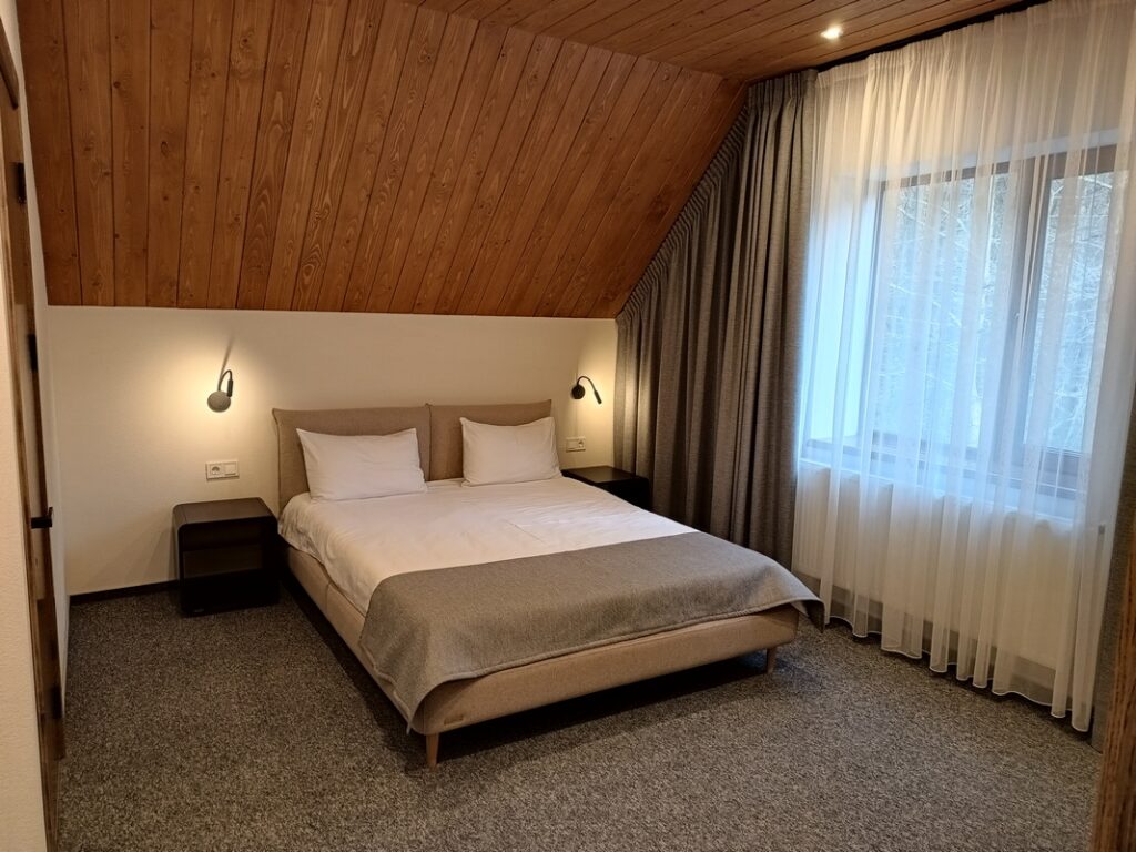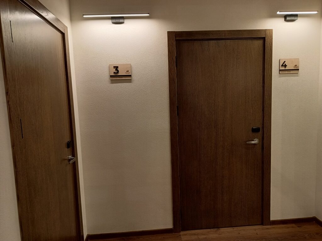 На першому поверсі чотири однокімнатних номера «Стандарт покращений» з повним санвузлом (душова кабіна) та повним наповненням меблями для комфортного проживання двох осіб. Двоспальне ліжко, приліжкові тумбочки, шафа для одягу, письмовий стіл / комод, стільці, тумба з міні-баром, смарт-телевізор, чайник і набір посуду для чаю, праска, прасувальна дошка, сушка для одягу.